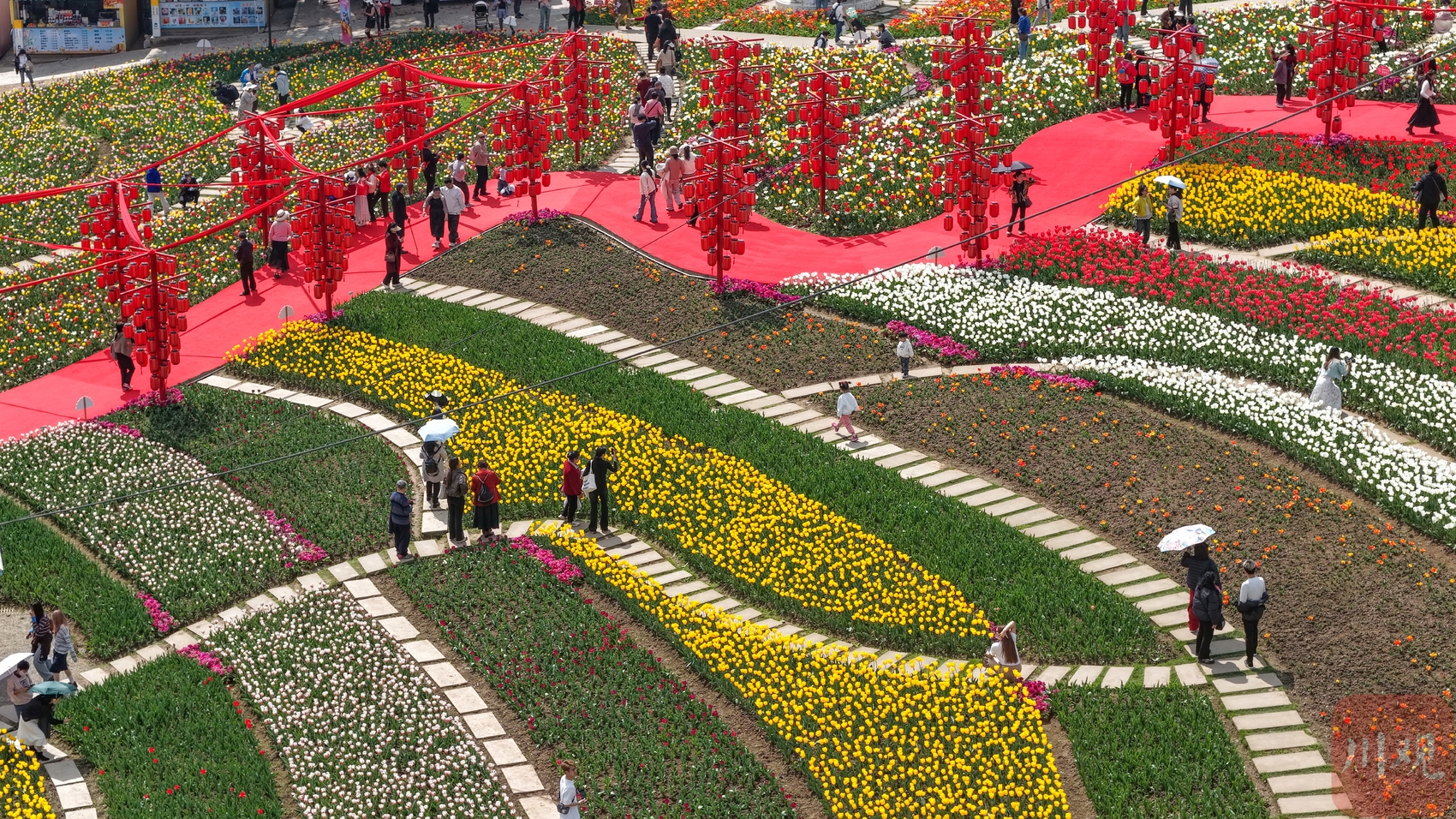 2026年3月4日,成都天气晴好,成都漫花庄园人流如织,成千上万朵樱花缀满枝头,与连片绽放的虞美人、郁金香等花卉相映成趣,织就一幅五彩斑斓的春日画卷,犹如春天里大自然的“调色盘”。