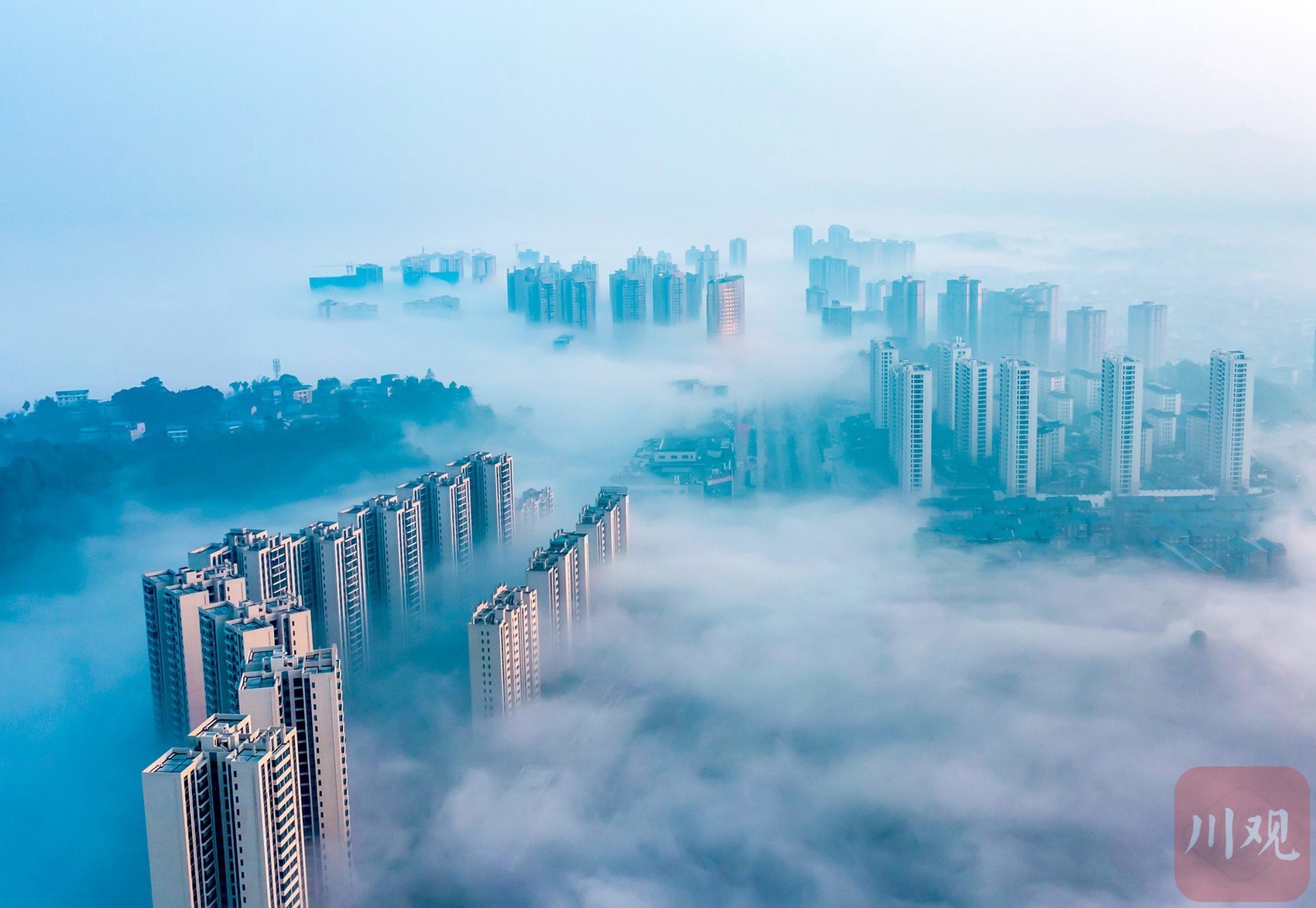 华蓥市蓥城碧桂园等住宅小区,在云雾缭绕下宛若海市蜃楼。
