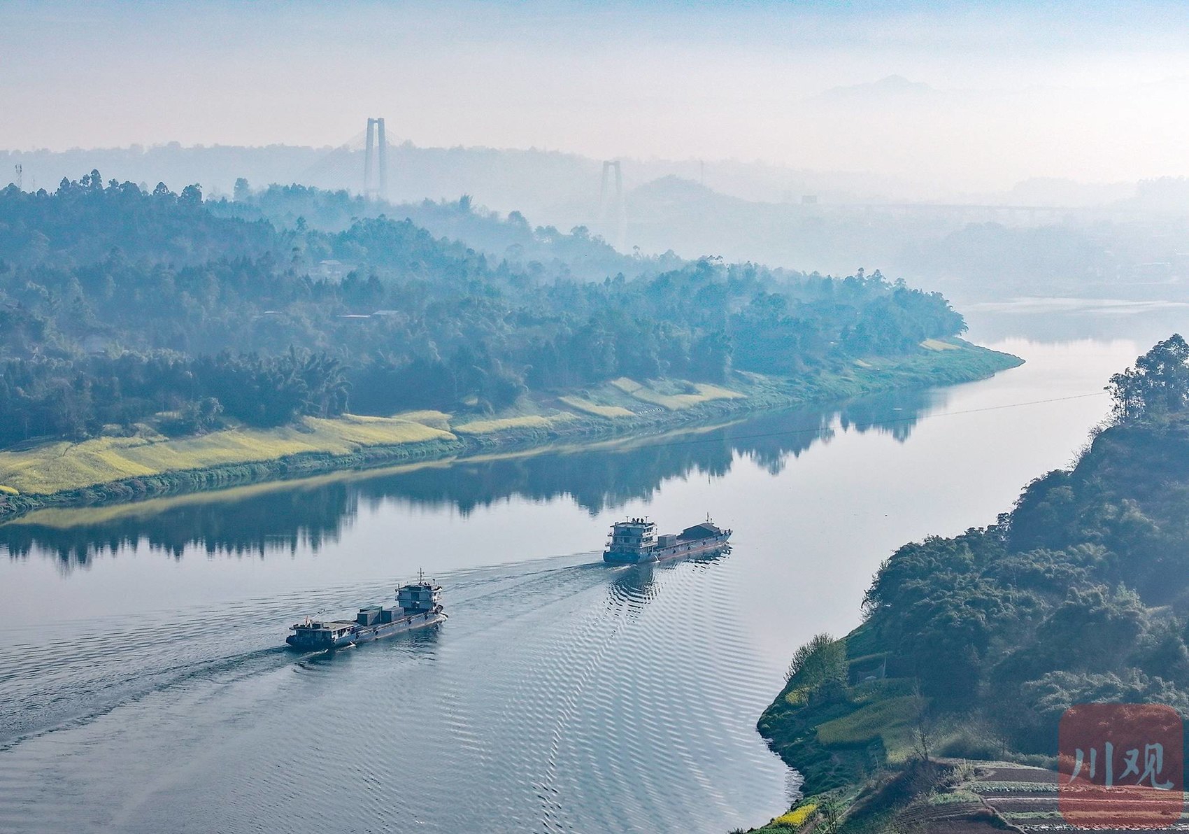 华蓥市明月镇白鹤咀村,货船行驶在油菜花点缀的渠江水域。