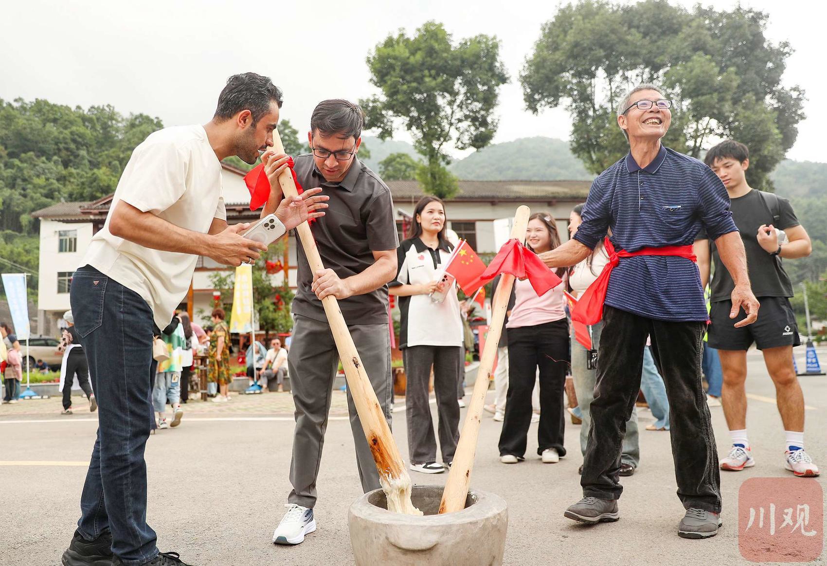 外国友人在华蓥市红岩乡体验传统文化打糍粑。